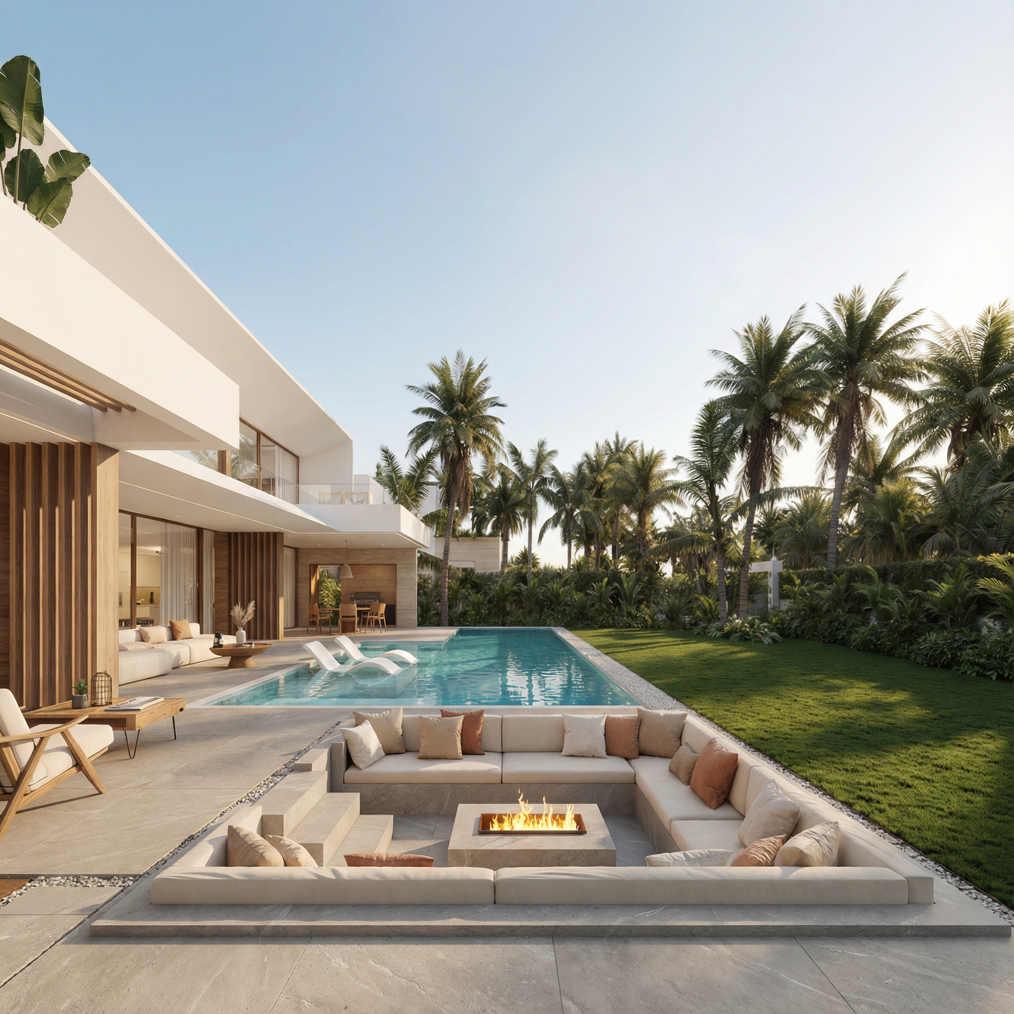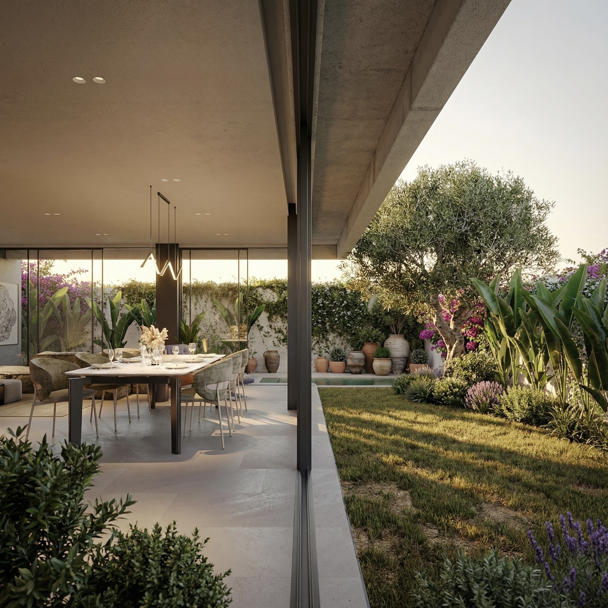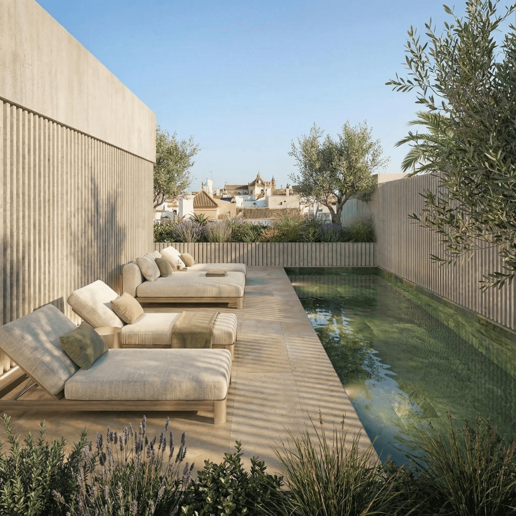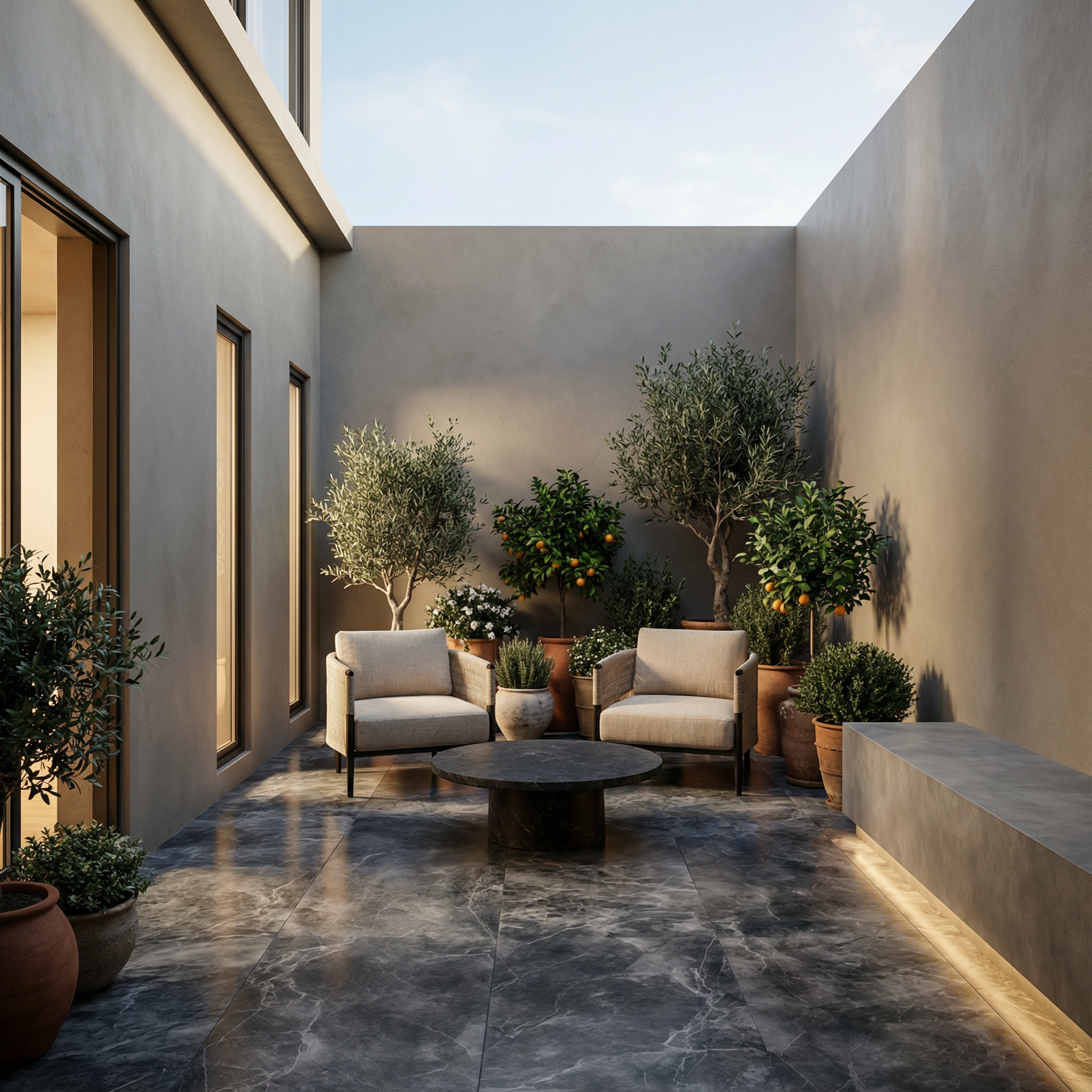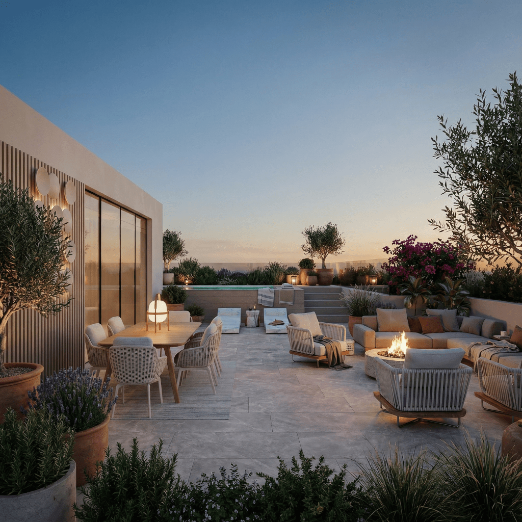 Outdoor spaces imagined as elevated extensions of architecture. Terraces become places for pause, openness, and contemplation, where light, views, and material textures define a calm and sophisticated outdoor experience.