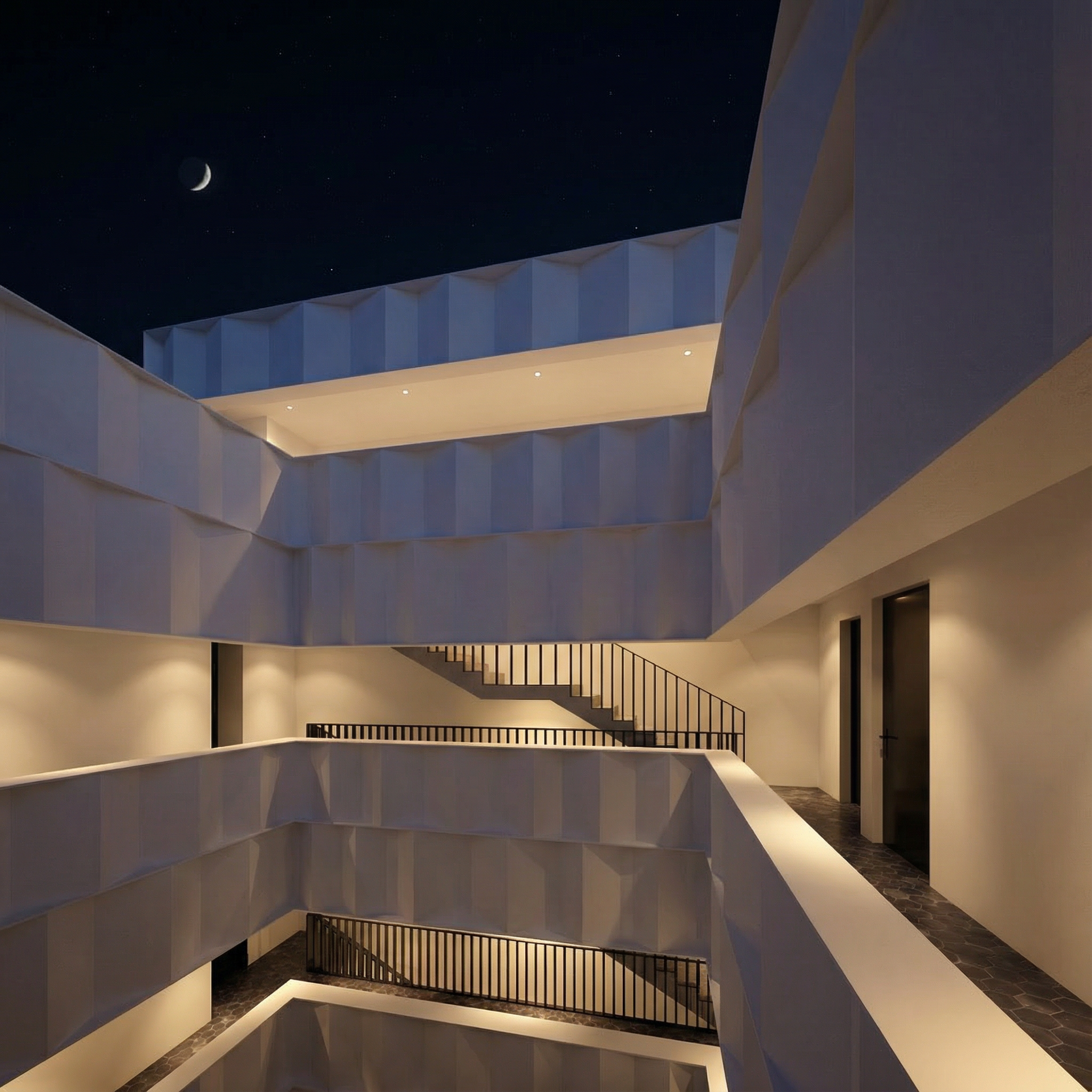 Intimate inner spaces designed as moments of retreat. Through the controlled use of light, shadow, and geometry, patios create quiet atmospheres that invite reflection, silence, and emotional balance within the built form.
